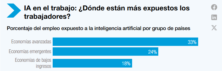 La UNCTAD estima que hasta 40 por ciento de los empleos mundiales podrían verse afectados por la IA y destaca que si bien la tecnología genera nuevas oportunidades,especialmente a través de ganancias de productividad y nuevas industrias,también plantea serias preocupaciones sobre la automatización y el desplazamiento de empleos,especialmente en economías donde la mano de obra de bajo costo ha sido una ventaja competitiva.