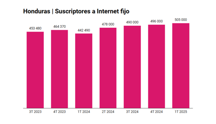 La Comisión Nacional de Telecomunicaciones (Conatel) registró 505,000 suscriptores a Internet fijo en Honduras al cierre del primer trimestre de 2025,lo que equivale a un incremento de 14.1% interanual. La cifra es la más alta registrada para ese servicio al momento. Más del 80% corresponde a suscriptores de banda ancha fija.