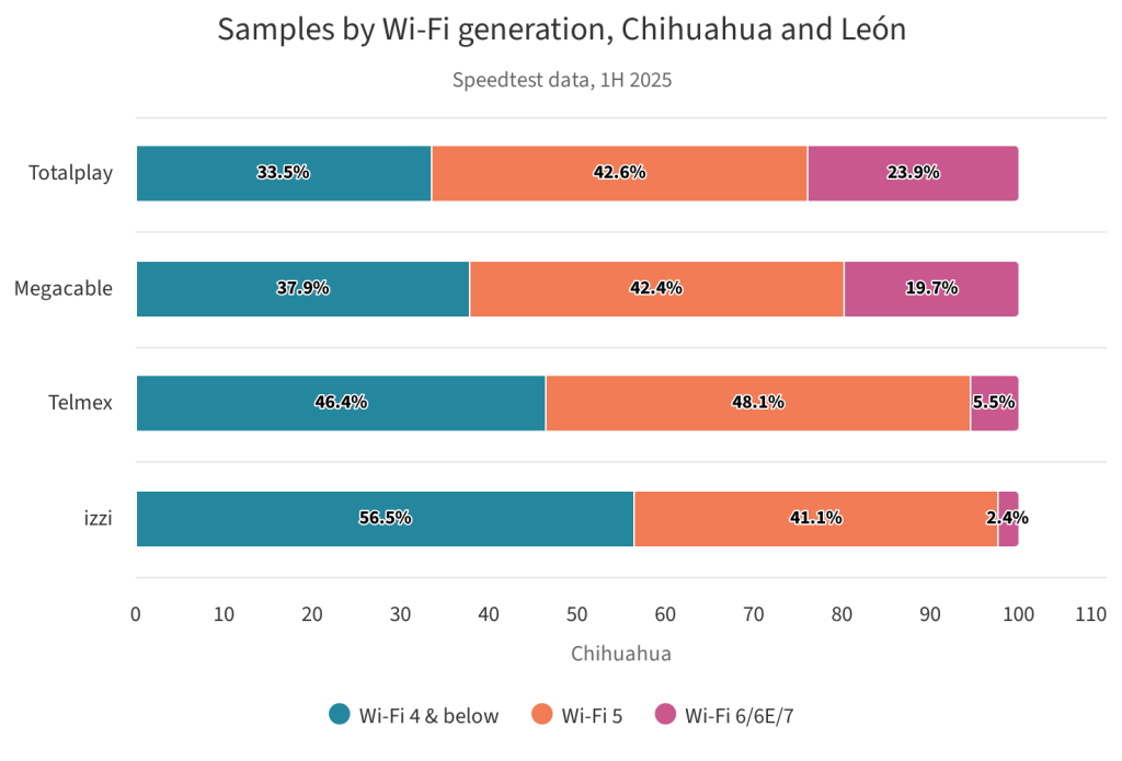 Según datos de Ookla,entre el 41 y 48% de las muestras de los principales cuatro proveedores (Telmex,Totalplay,izzi y Megacable) correspondían a WiFi 5,y entre el 33 al 56.5% a WiFi 4 o inferiores.